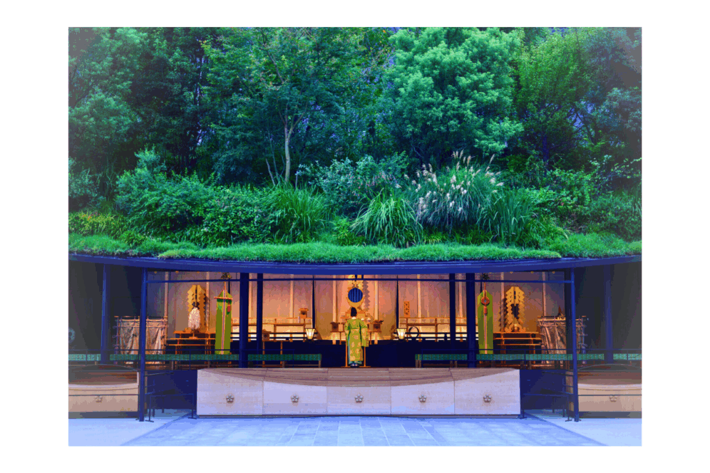 この仮殿が、屋根の上に草木が浮かんでいるデザインで、本当にカッコイイ!設計されたのは藤本壮介さんという建築家の方。