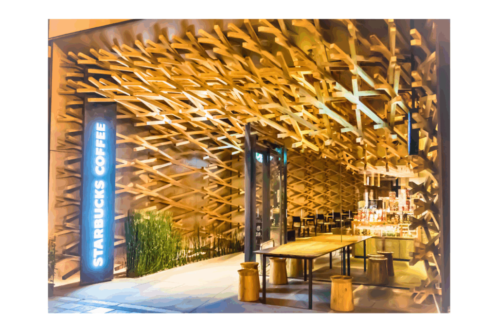 木材を組み込んだデザインがとにかくカッコイイ!店内はコーヒーと共に木の香りも漂う、とても居心地のいい空間になっています。カフェ好き、スタバ好きさんは、ぜひ立ち寄ってみてください。