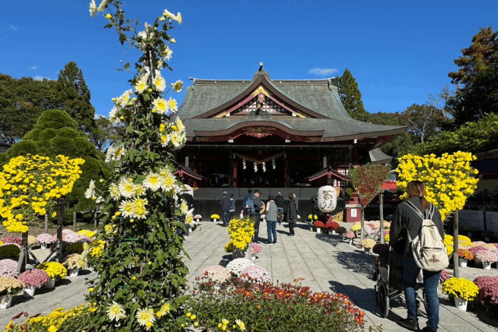 毎年10月ごろに行われる「菊まつり」は日本最古の菊祭りとして有名で、時代絵巻を再現した「菊人形」は見応え十分。菊人形の菊は毎日手入れされ、咲き誇る花を入れ替えながら、いまが盛りと人々を迎えます。