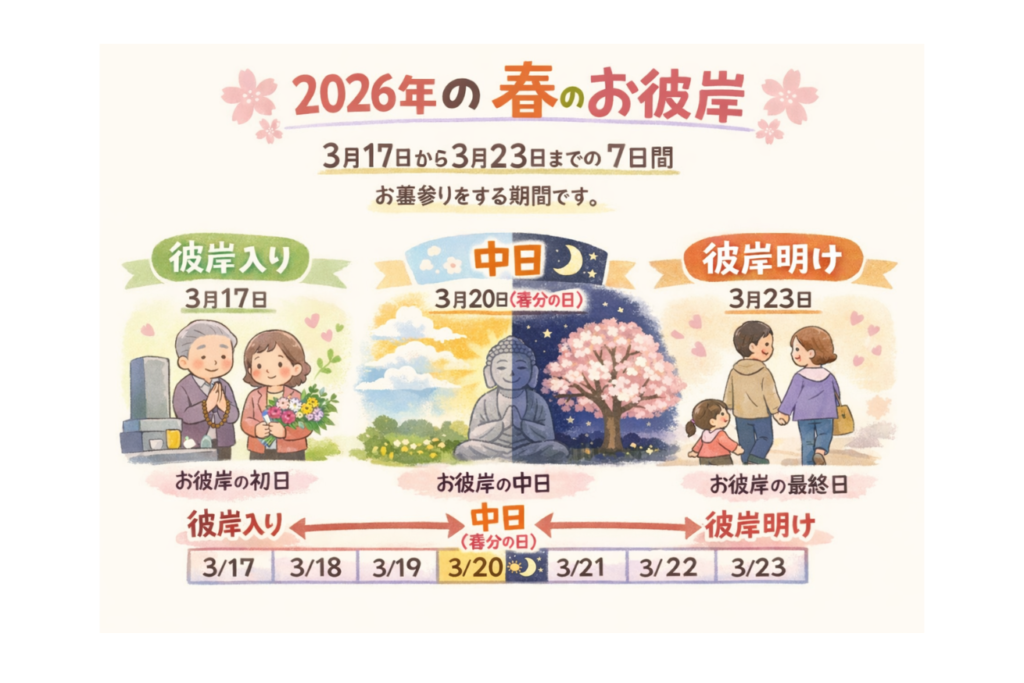 2026年の場合は春分の日が3月20日にあたり、その前後3日間つまり、3月17日から3月23日までの7日間が春のお彼岸に当たります。