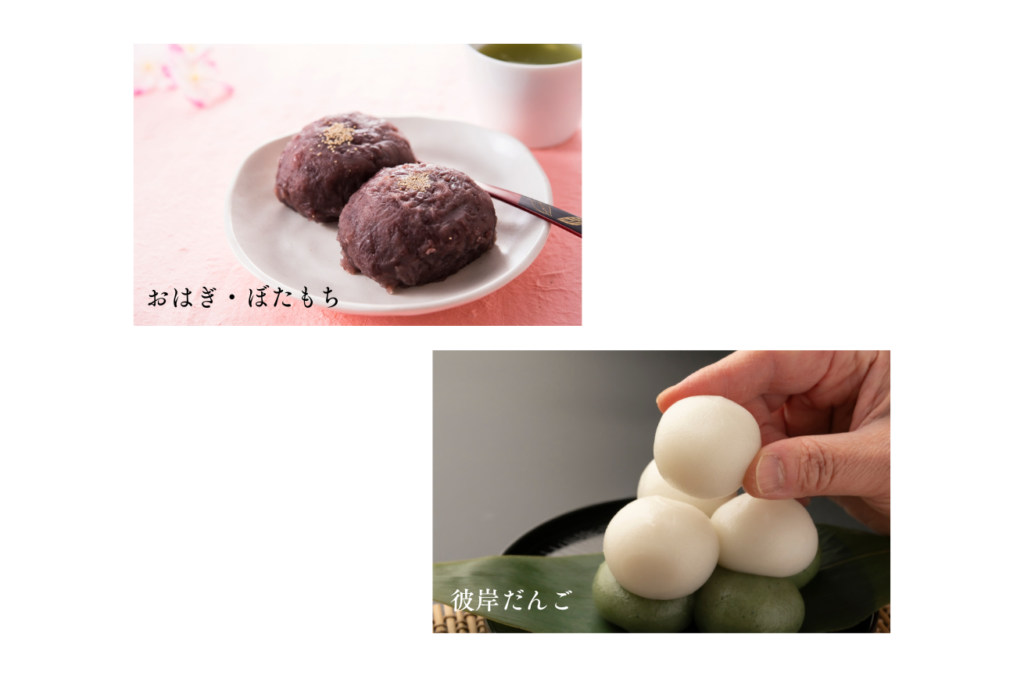 春:牡丹餅(ぼたもち)・・・春に咲く「牡丹の花」に見立て、小豆の粒をそのままにした「粒あん」や「こしあん」で作る。