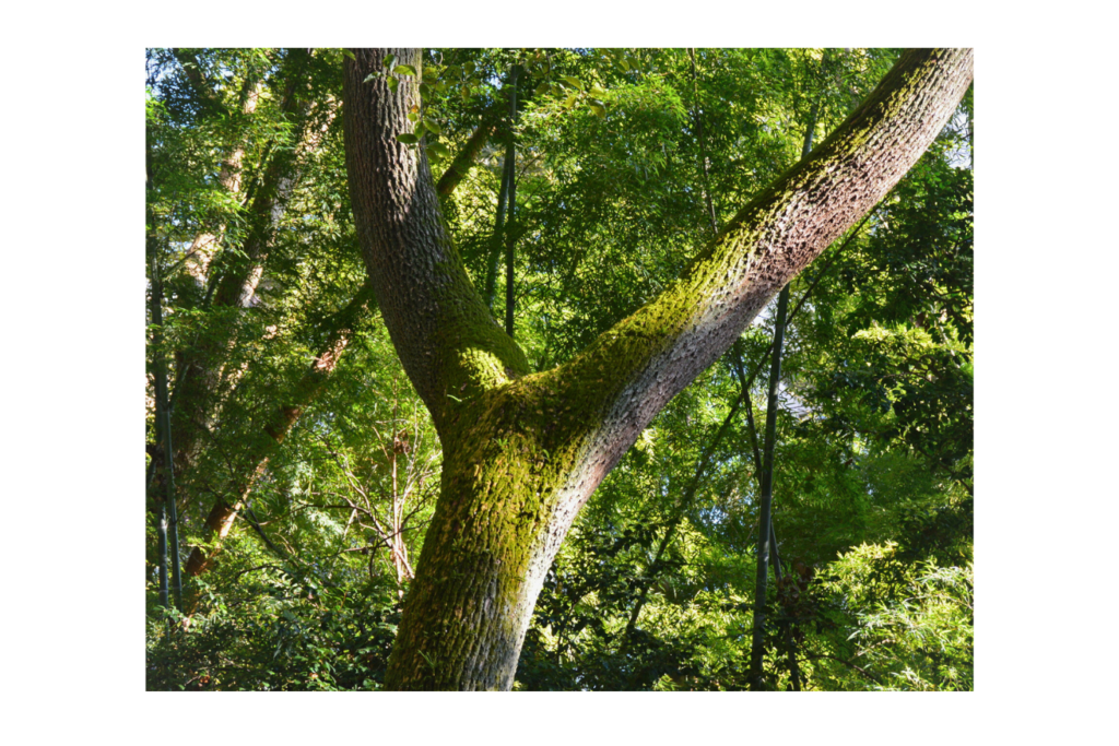 境内には樹齢数百年の大きな楠が何本も立っており、特に拝殿の横にある御神木は、生命力の象徴として崇敬を集めています。
