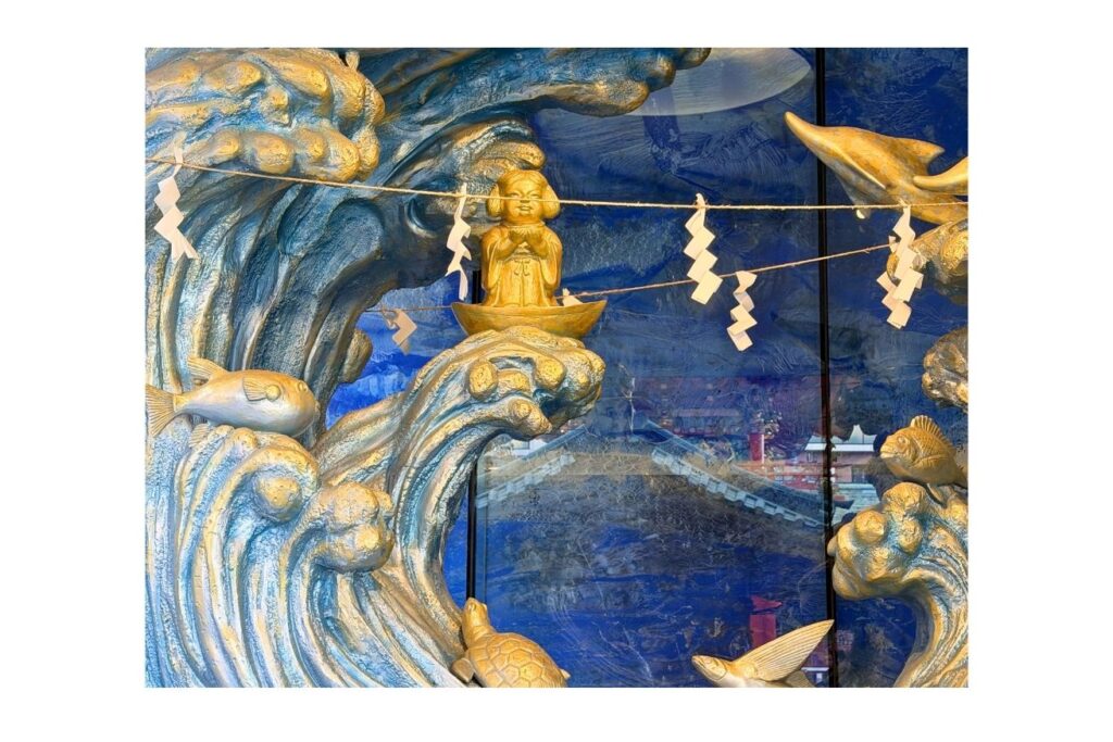 作られたのは東京芸術大学の元学長さんだそうで、ダイナミックな波に、イルカやら亀やらがいるという現代的な造形がとても興味深いです。