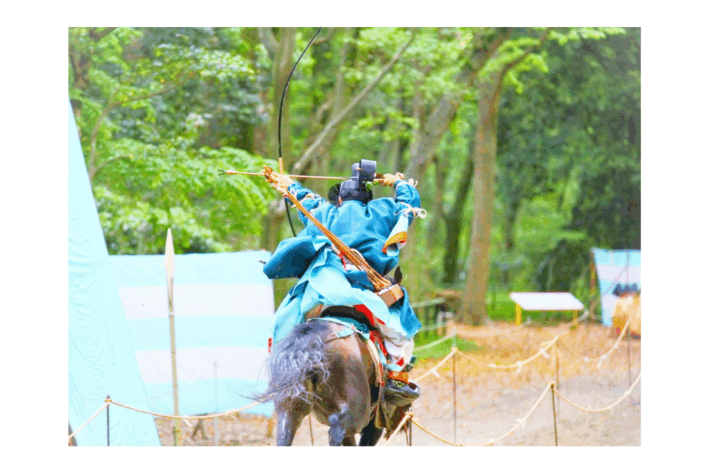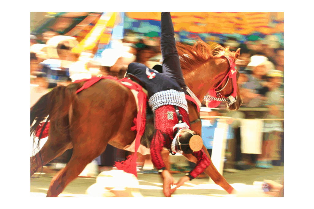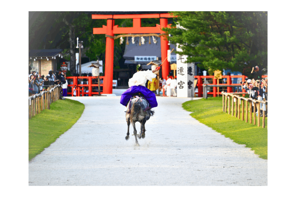 鎧姿の騎手が馬上で逆立ちや手綱潜りなどアクロバティックな技を披露する神事は圧巻です!