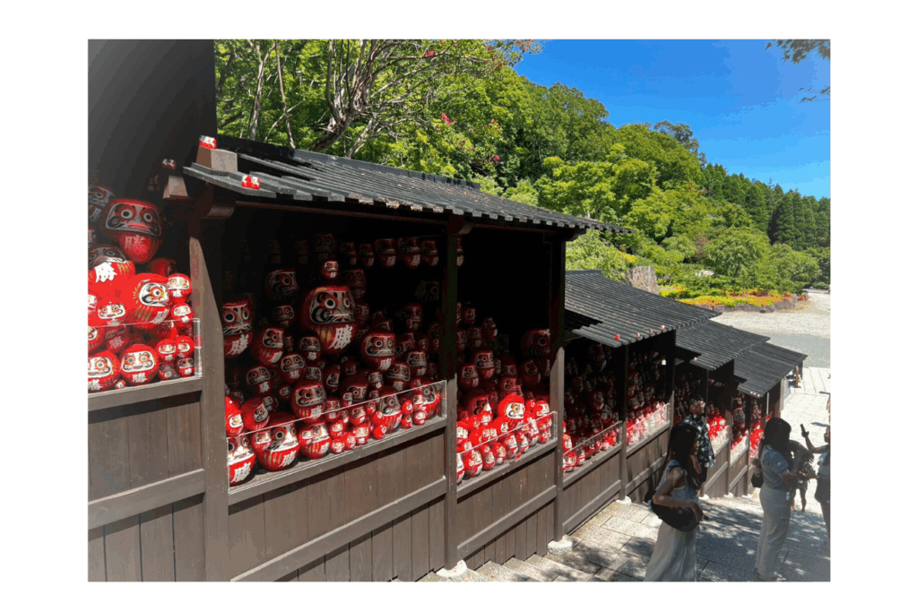 階段を中腹くらいまで上がったとこで、びっしりとダルマが並べられた壁が現れました。願いがかなった「勝ちダルマ」を奉納する場所のようですが、インバウンドの方々の撮影スポットとなっていました。確かに、日本らしい景色で、赤いダルマたちがかなり映えています。