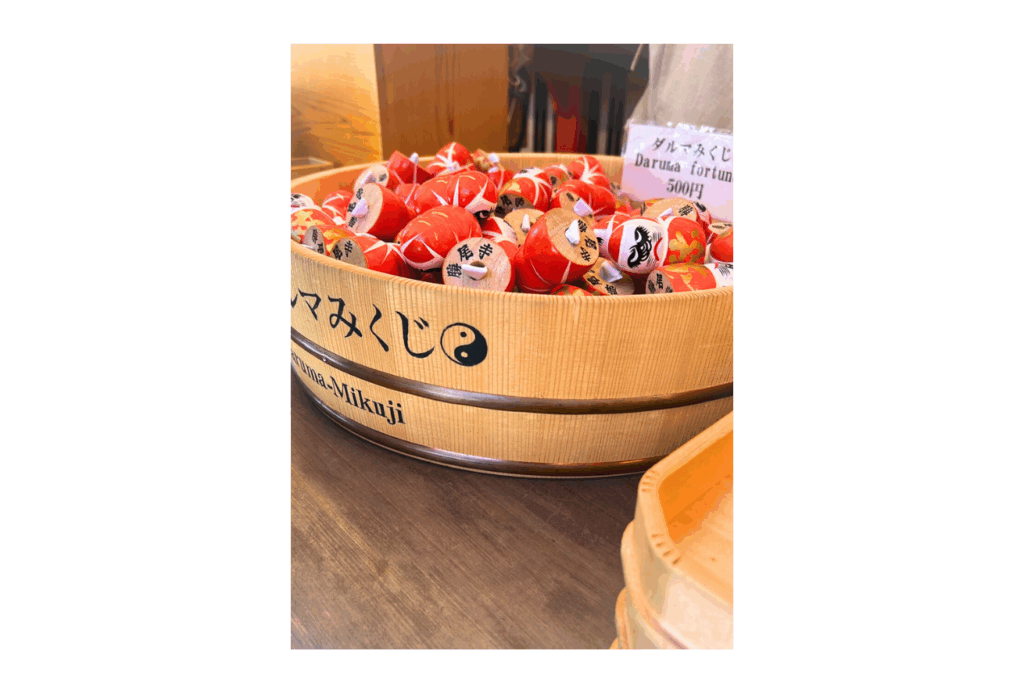せっかくなのでいただいて帰ろうと思って並んでいると、筆者の前にいたおそらくタイからの観光客の女性が、悩みながらダルマみくじを持って、指を3、と作りました。3つ買うのかな?と思って見ていたら、何と購入した数は30個!さらに、「ヘルス」「ラッキー」と単語を並べて、お守りをどんどん購入されていきます。まさかのここで、爆買い…かなりびっくりしました。