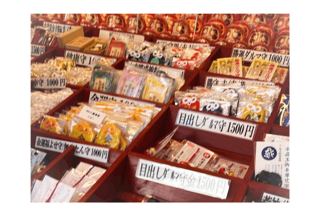 本堂には、入口からのんびり進んで、10分ほどで到着しました。参拝し終えると、向かい側には「本堂前お授け所」という勝ちダルマやお守りを授与していただける場所があります。境内にたくさん奉納されているダルマみくじも、こちらでのみ購入できる様子。