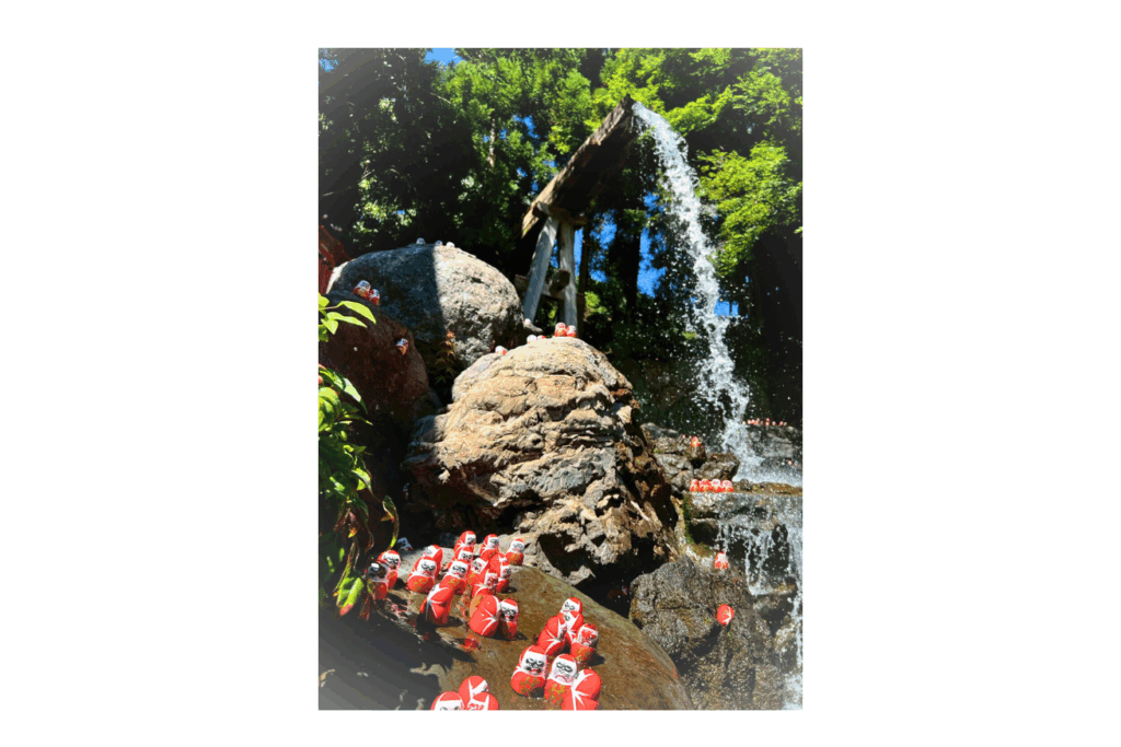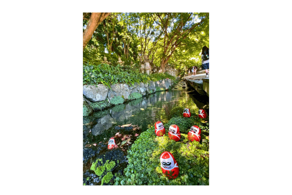 立派な噴水を見ながら渡り終えたら、そこはダルマのワンダーランドでした。もう、いたるところに、ダルマ、ダルマ、ダルマです。どうやら参拝客が「ダルマみくじ」というおみくじのダルマを境内に奉納しているようなのですが、これが本当にカワイイ!