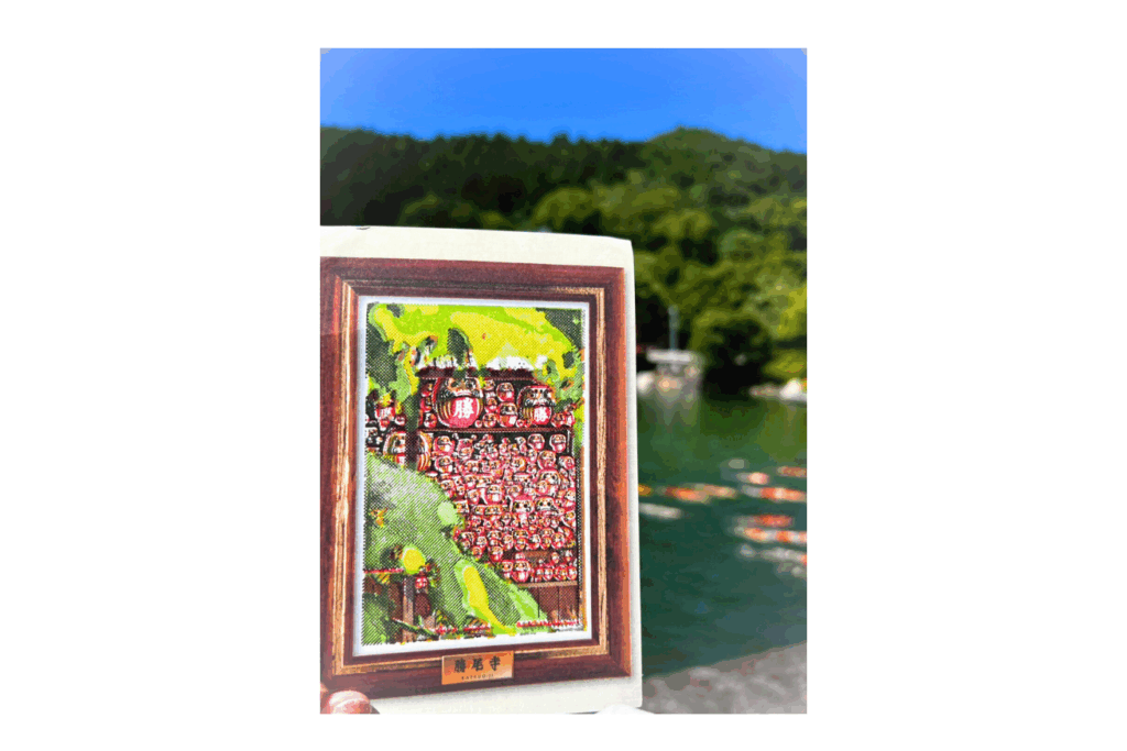 下りて行きながら、途中途中でスタンプを押し、鯉がいる池のそばで、ついにラストのスタンプを押して完成です。ステキな絵葉書が関係しました!結構感動しますね。