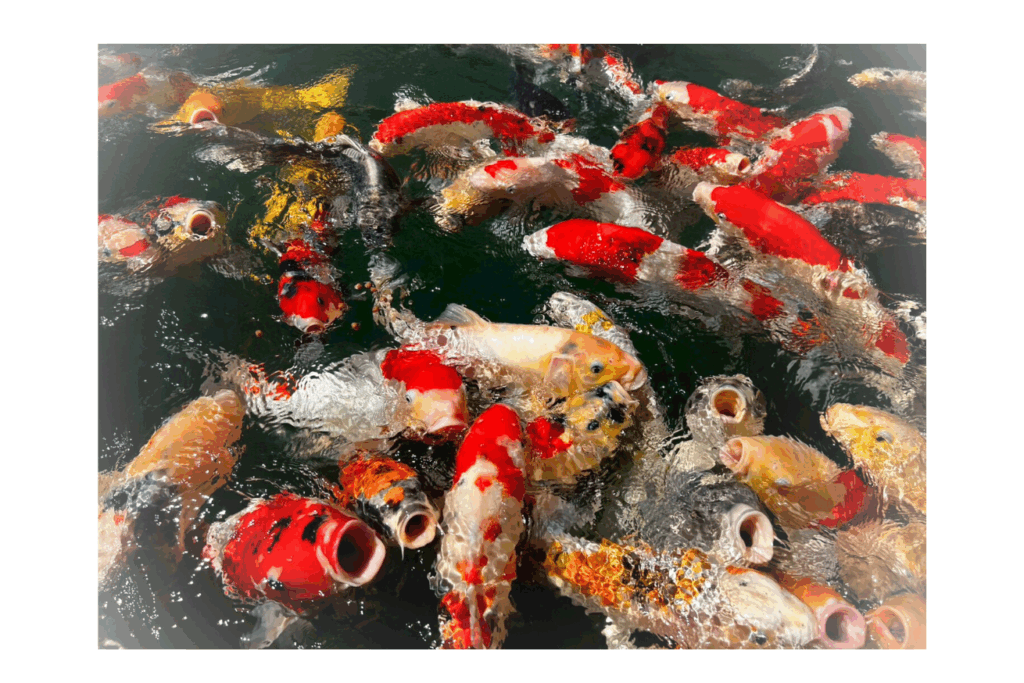 後で写真を見たら、まるで合成のような映像が撮れていました。色とりどりの鯉たちなので、カラフルなペイントみたいでした。
