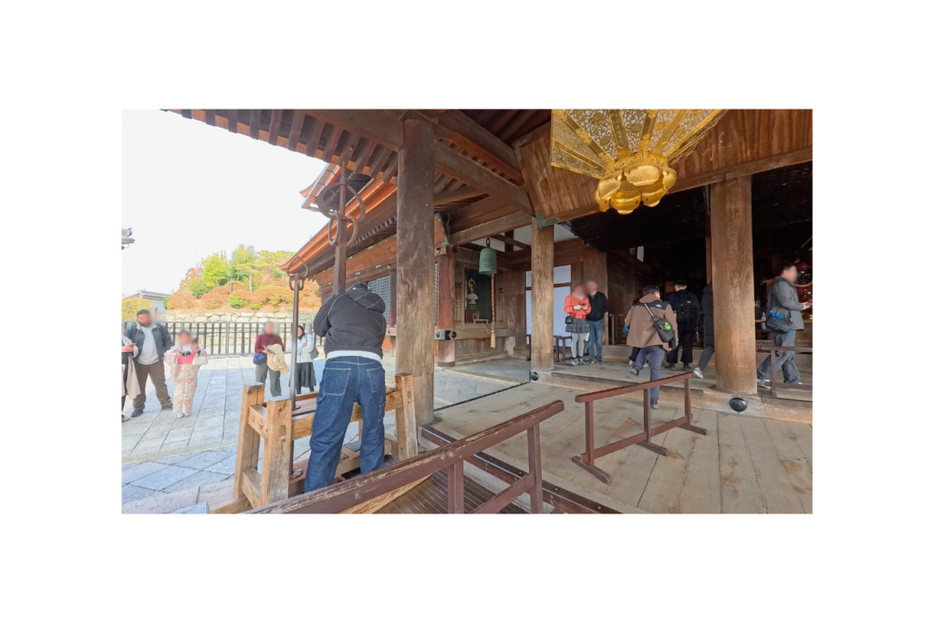しばらくボーっとした後、本堂の中へ移動。靴を脱いで入ることができます。少しだけ並んだ後、鐘をついて参拝。本尊の観音様と、その周りにたくさんの仏様が見えとてもありがたい光景でした。