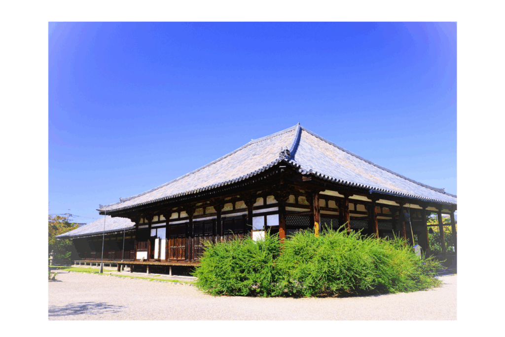 飛鳥時代に創建された、日本最古の本格的仏教寺院と言われる寺院。世界遺産の一部でありながらも観光地の中心部からやや離れているためか、土日でもそこまで混雑しておらず静かに参拝できるのも魅力的です。建立時に作られた日本初の瓦が使用されており、現在でも本堂・禅室の屋根に数千枚が残っているそう。また、本堂内の柱の一部も創建当時のものを使用しており、しかも触れることが許されているのに驚きます。
