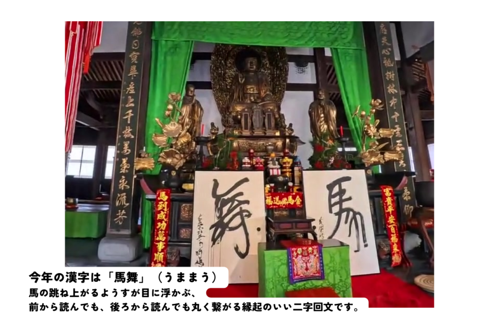 逆さから読んでも同じになる縁起の良い二文字で、躍動感あふれる筆致がすばらしいです。「馬」の文字が、本物の馬に見えるのもキュートでした。