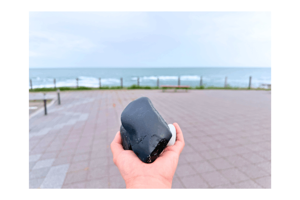 途中、せっかく海に来たのだからと、波打ち際でビーチコーミングをすることにしました。とは言っても、こちらはほぼ石の海岸。ビーチグラスや貝殻はあまり見つかりません。それでも私は、石の中から、少し透き通った小さな黄色い石を発見。一方、同行していた運営は、「1つにしなさい!」という忠告も聞かず、重い石を3つも拾っていました…