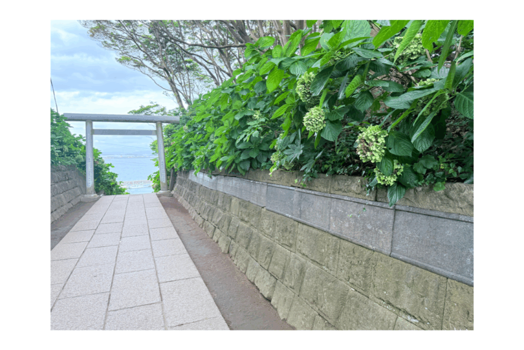 その中でも特に気になったのが、木が密集してトンネルのようになった参道と、紫陽花に挟まれた参道と鳥居の向こう側に海が見えるという景色。この2つ、何と同じ神社で撮られた写真だそう。その場所は、茨城県にある、“酒列磯前神社”さん。