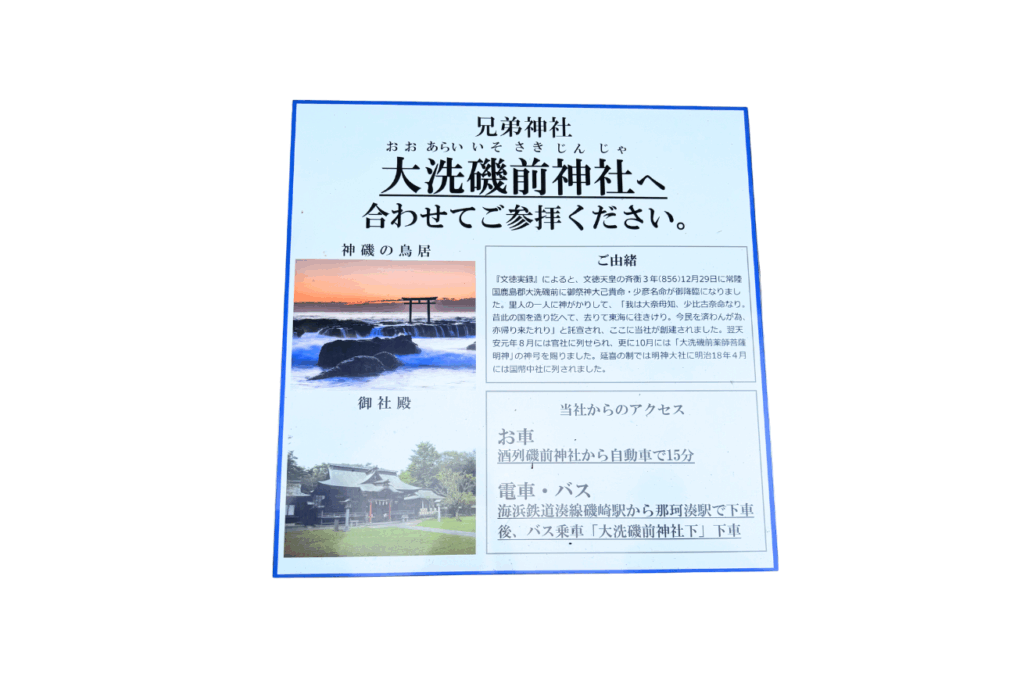 隣接する大洗町にあるこの神社と酒列磯前神社は、兄弟神社とされていて、二社で一対と言われています。