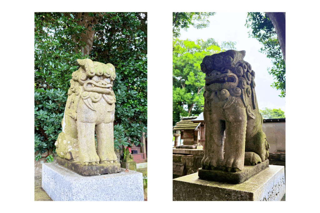 樹叢ゾーンの先、まっすぐ伸びた参道の先に、本殿があります。その中央にある鳥居のそばには、何とも珍しいお顔の狛犬ちゃん。