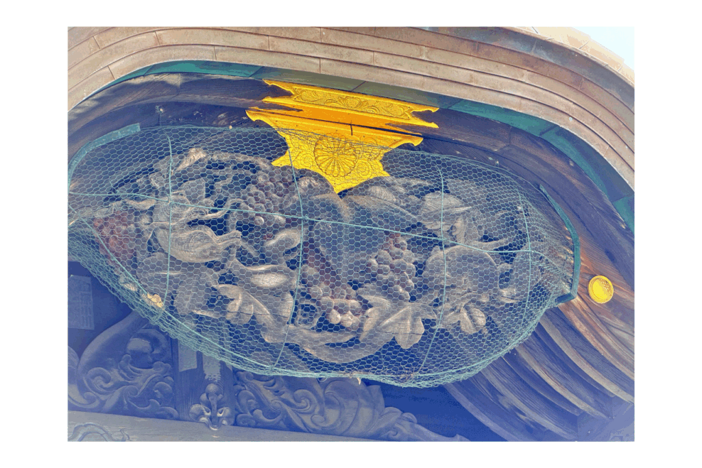 さて、ここで絶対に見ていただきたいのが、拝殿上にある彫刻です。