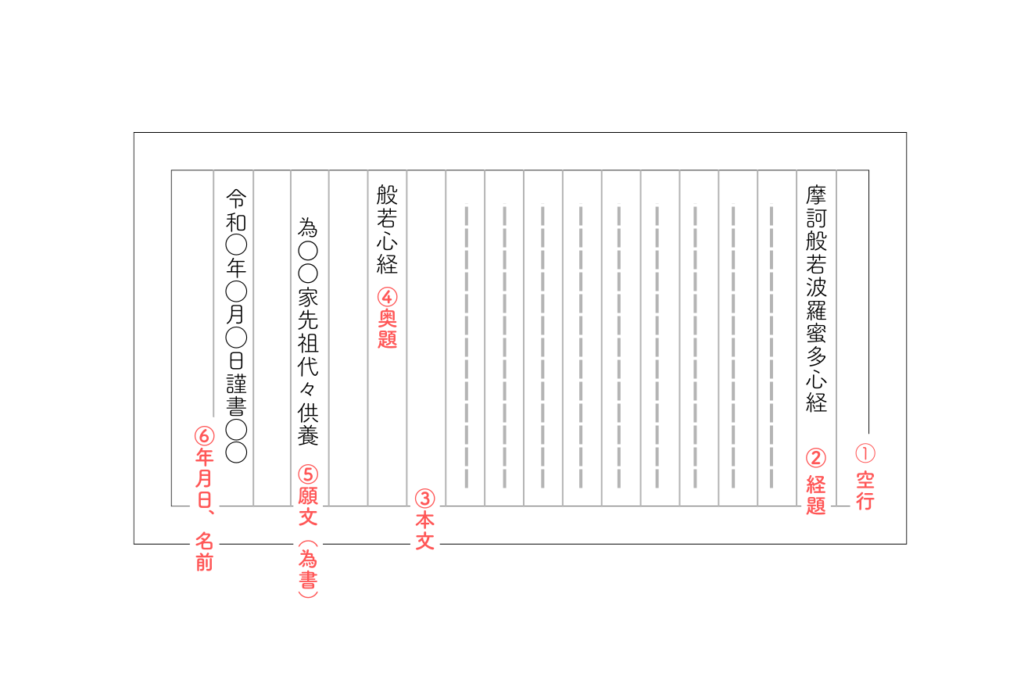 写経した日の日時と、写経した人の名前を記入し、最後に「謹書」または「敬書」と記入して結びます。