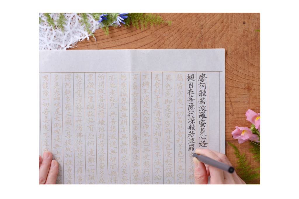 お経を書き写すこと自体に功徳があるとされ、個人の願い事だけでなく、他者のために供養や祈りを込めることもできます。