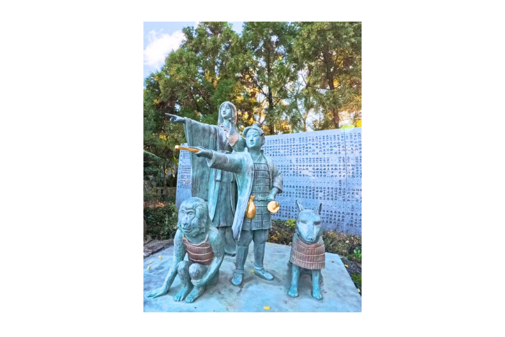 参道を左に曲ると、その先には、倭迹迹日百襲姫命と桃太郎、そしてお供たちの像がありました。