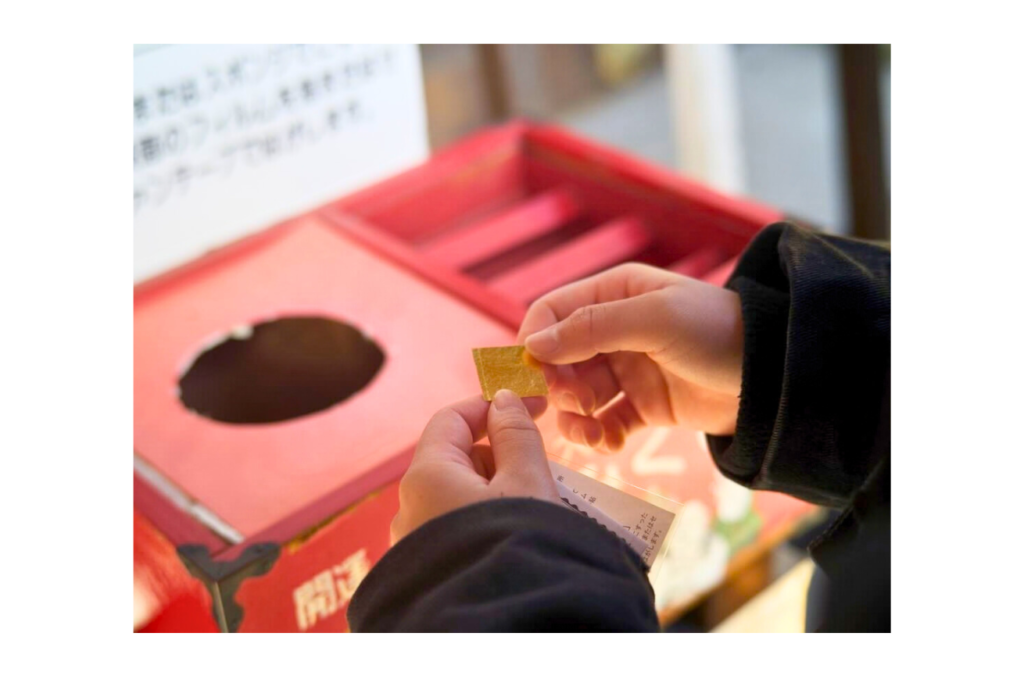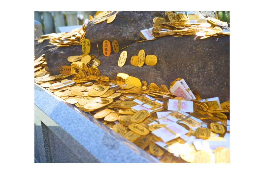 そして、龍の足元には、大量の小判が。「龍神に黄金を供えると長者になる」という伝説にあやかり、願いを書いた小判を供えるアトラクション…もとい、参拝だそうです。