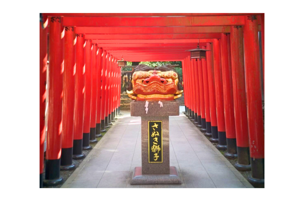 稲荷社からは裏手に向けて、ずらりと鳥居が並んでいます。こちらはなかなか神秘的。北参道の真ん中には、さぬき獅子の像があり、結構迫力がありました。