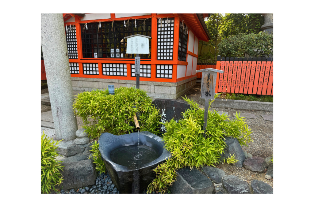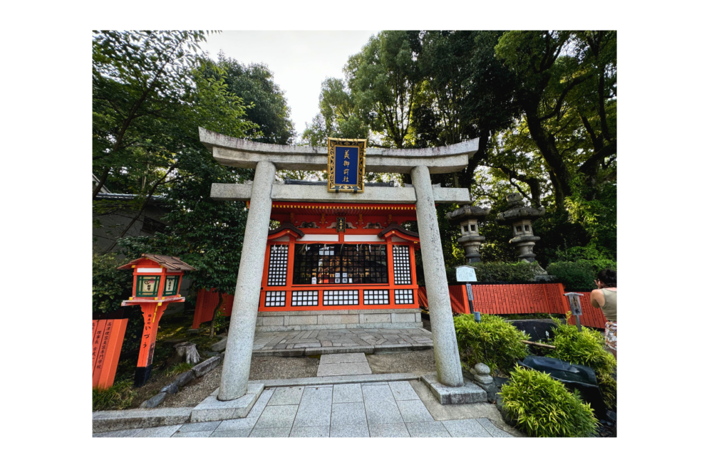 本殿の東側には、美人三姉妹と言われる宗像三女神を祀る美御前社があります。芸妓さんや舞妓さんも足しげく通う、“京都きっての美の神様”で、きれいになりたい女性はぜひ参拝していただきたいスポットです。社殿の前には「美容水」と呼ばれるご神水が湧き出ており、顔に2~3滴つけると美しくなれると言われています。