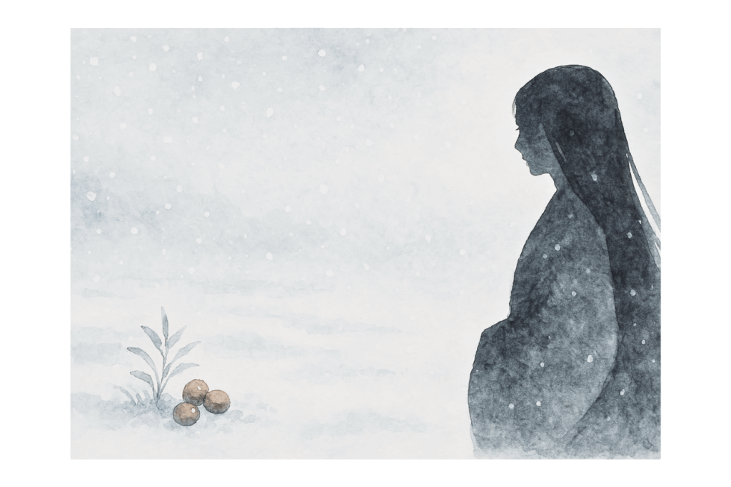 少将は毎晩小町の邸宅に通って、訪れた証となる“かやの実”を1つずつ置いていきます。99日通った翌日、ついに100日目となったその日は雪が降っていました。