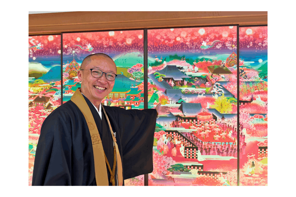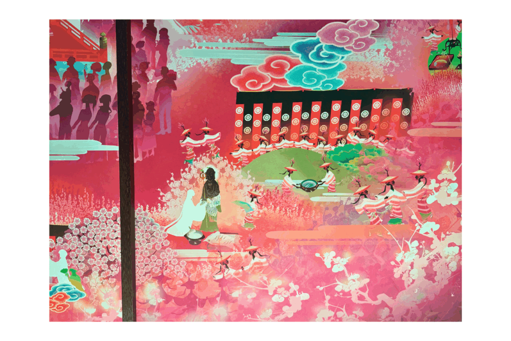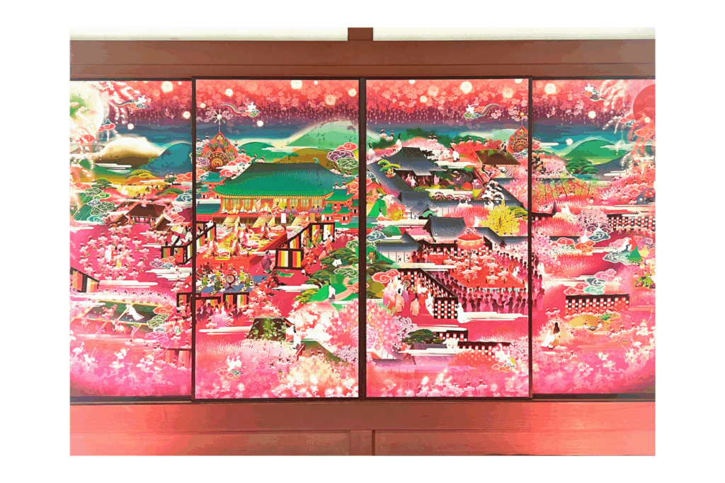 この鮮やかな「極彩色梅匂小町絵図」という襖絵は、コンピュータグラフィックアーティストのだるま商店さんが手がけたもの。